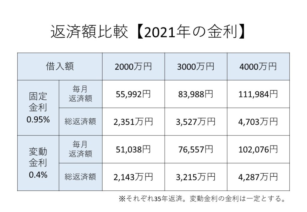 変動金利は最低金利の住宅ローンは 0.4%前後です。(2021年10月時点)